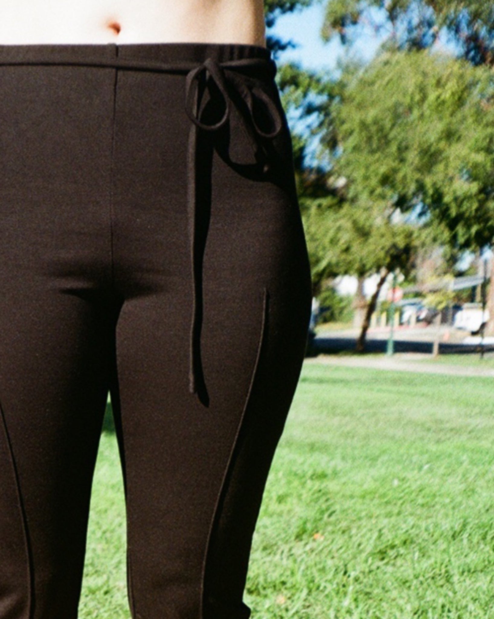 Stretchy capris with pintuck detailing and a bow tie at the waist, offering both comfort and style.