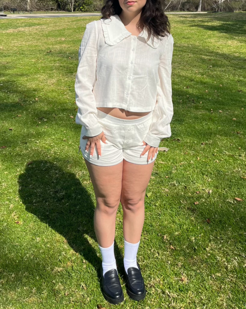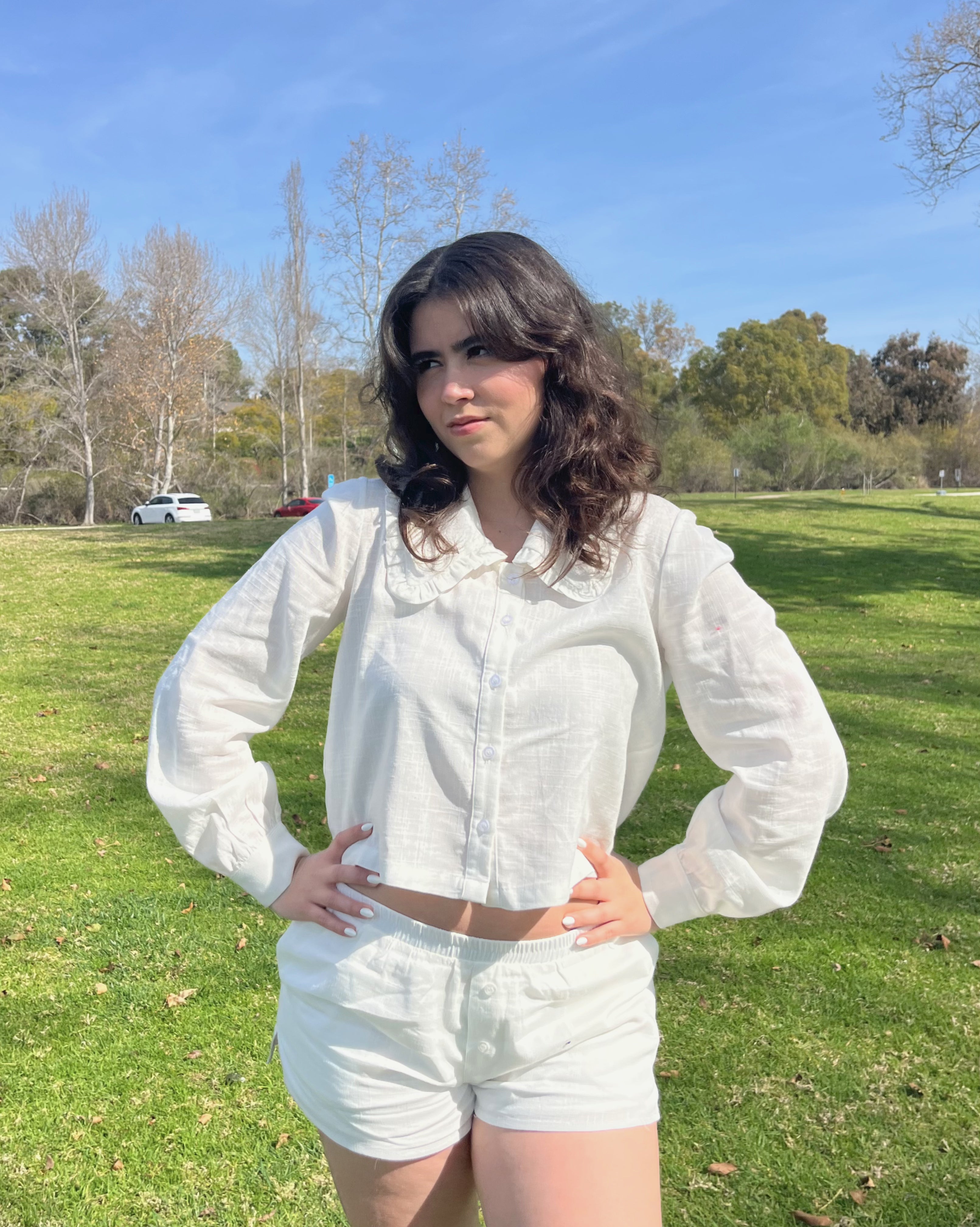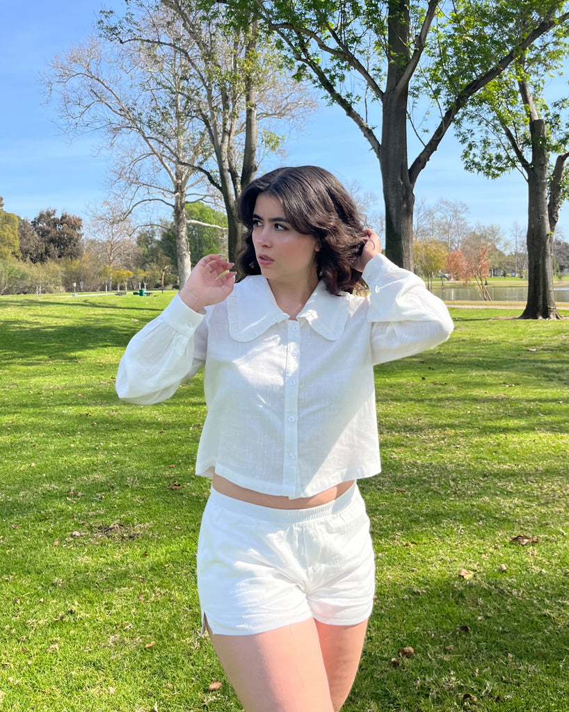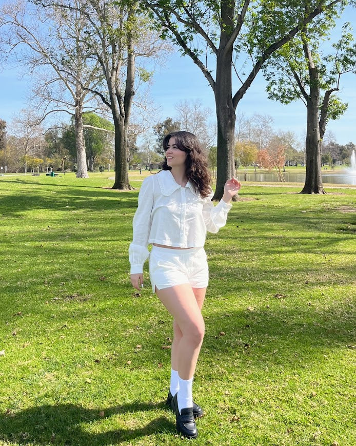 Linen shorts with back pocket detail. *Part of a matching set with our Love Letter Collared Top