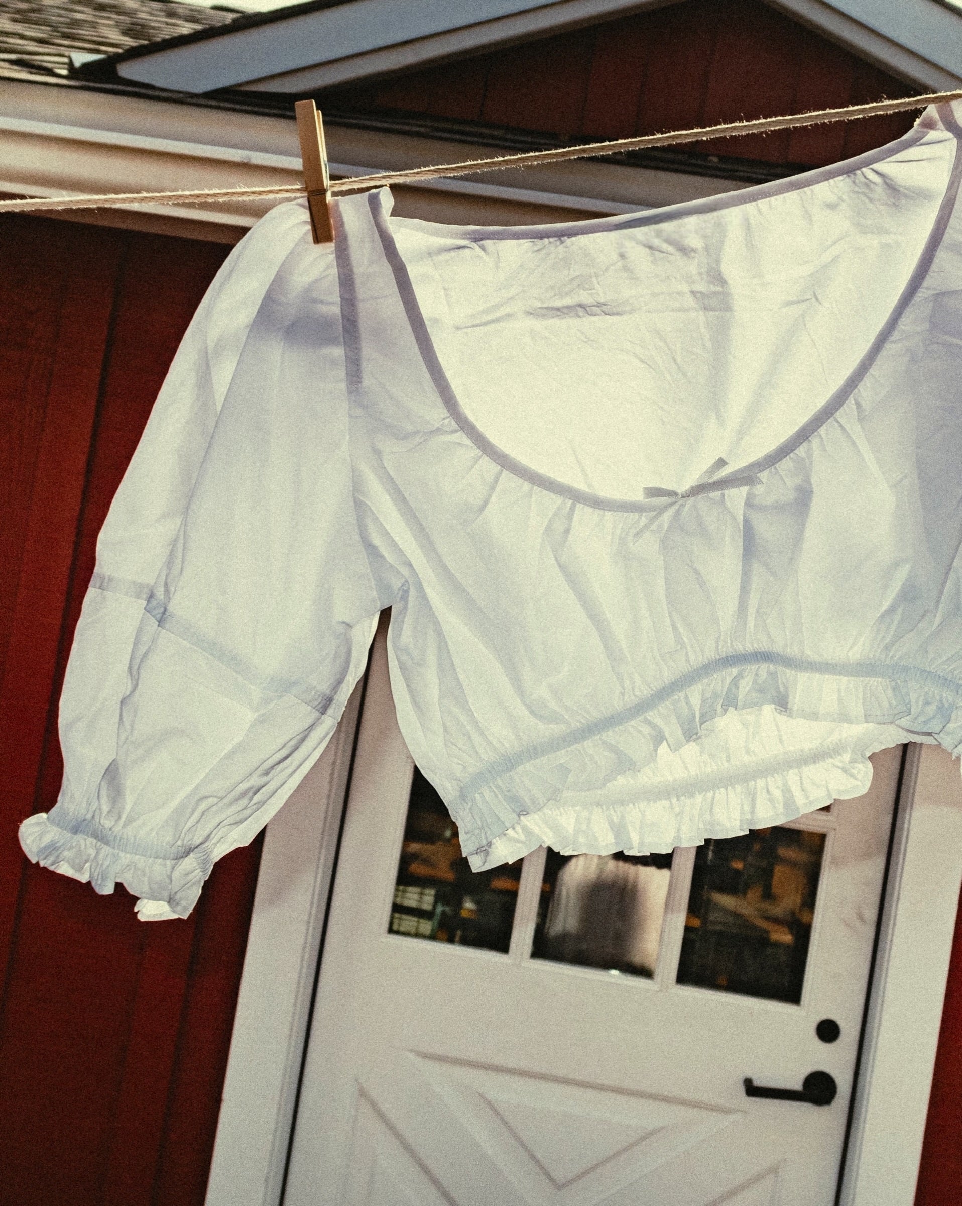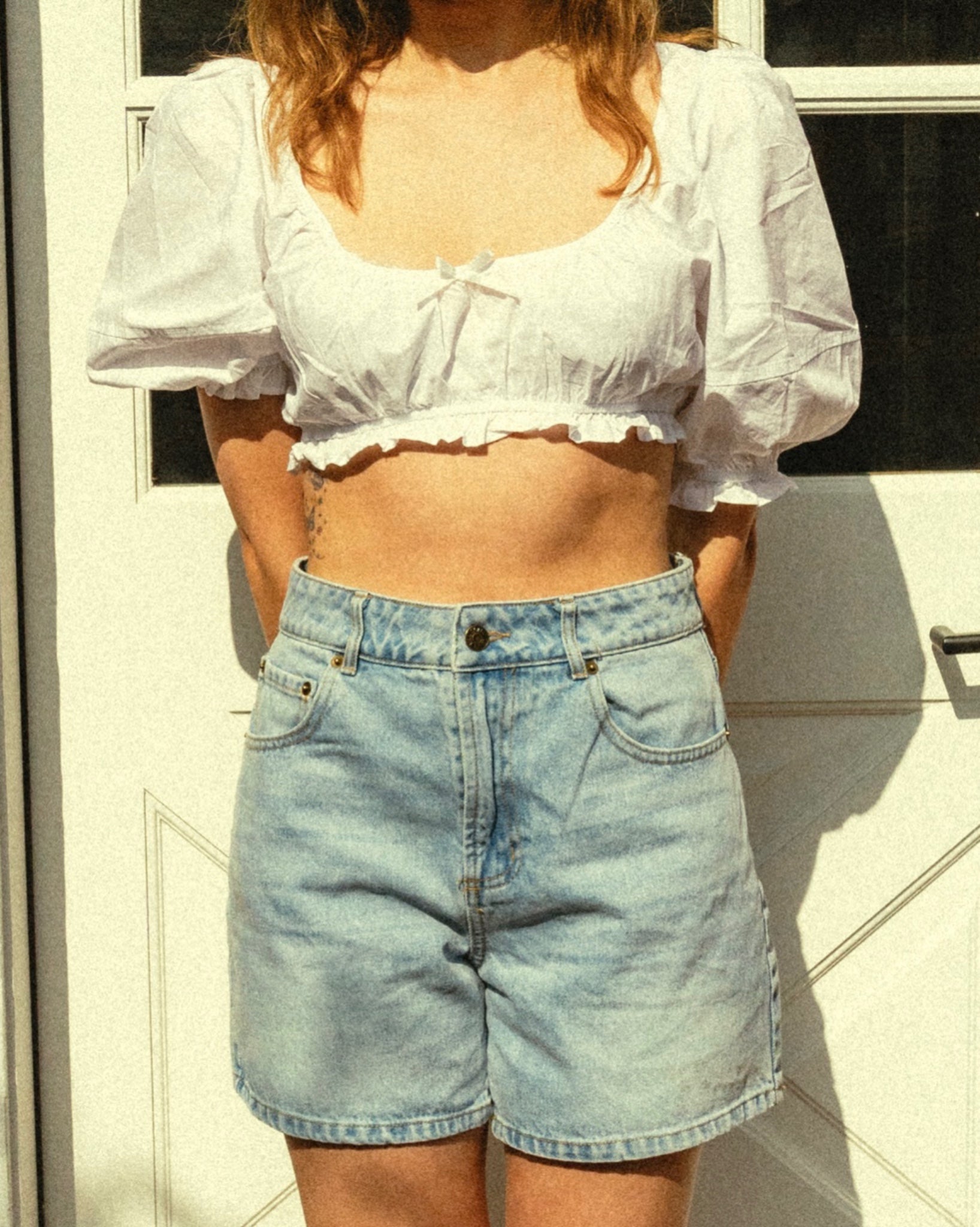 The Sweet Cream Puff Sleeve Top showcases a bow detail and ruffled hem. Featuring charming puff sleeves.