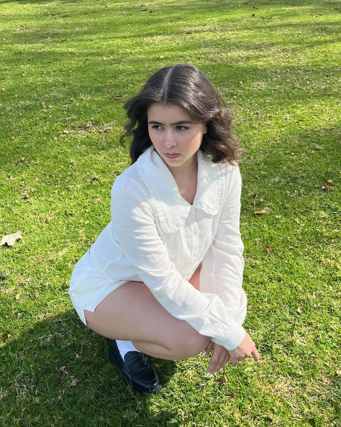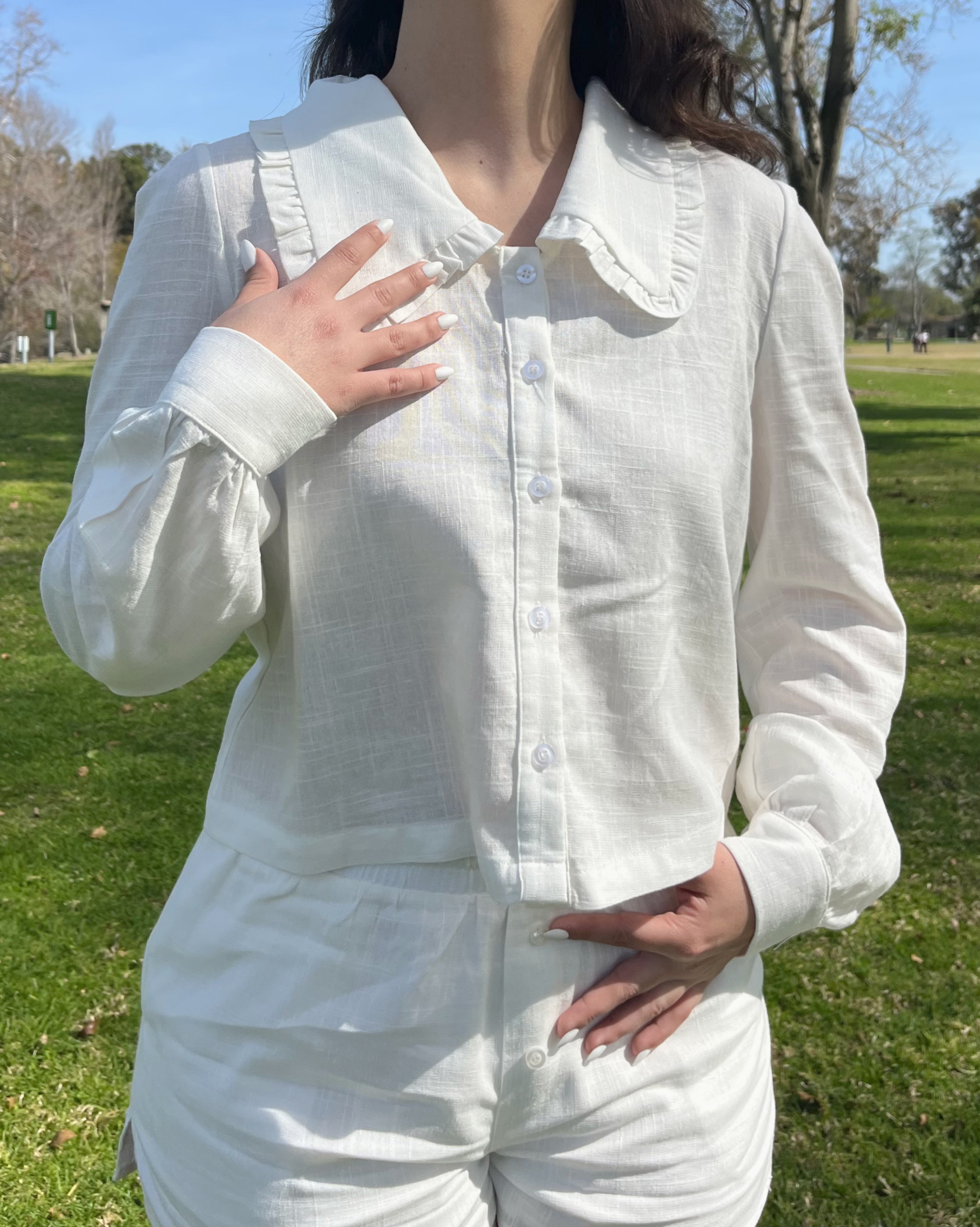 Linen ruffled collar button down shirt *Part of a matching set with our Love Letter shorts