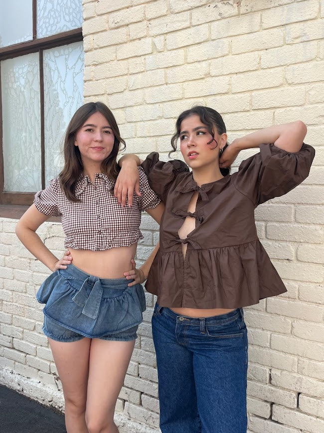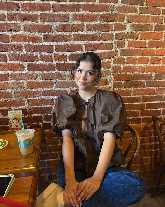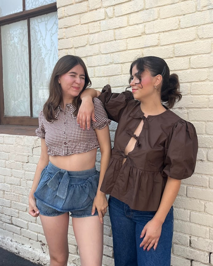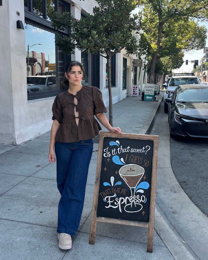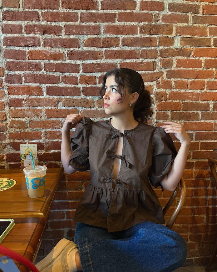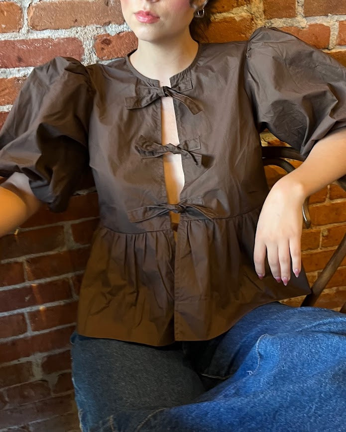Introducing our Espresso Top! The cutest front tying top in the perfect shade of brown with puff sleeve detail.