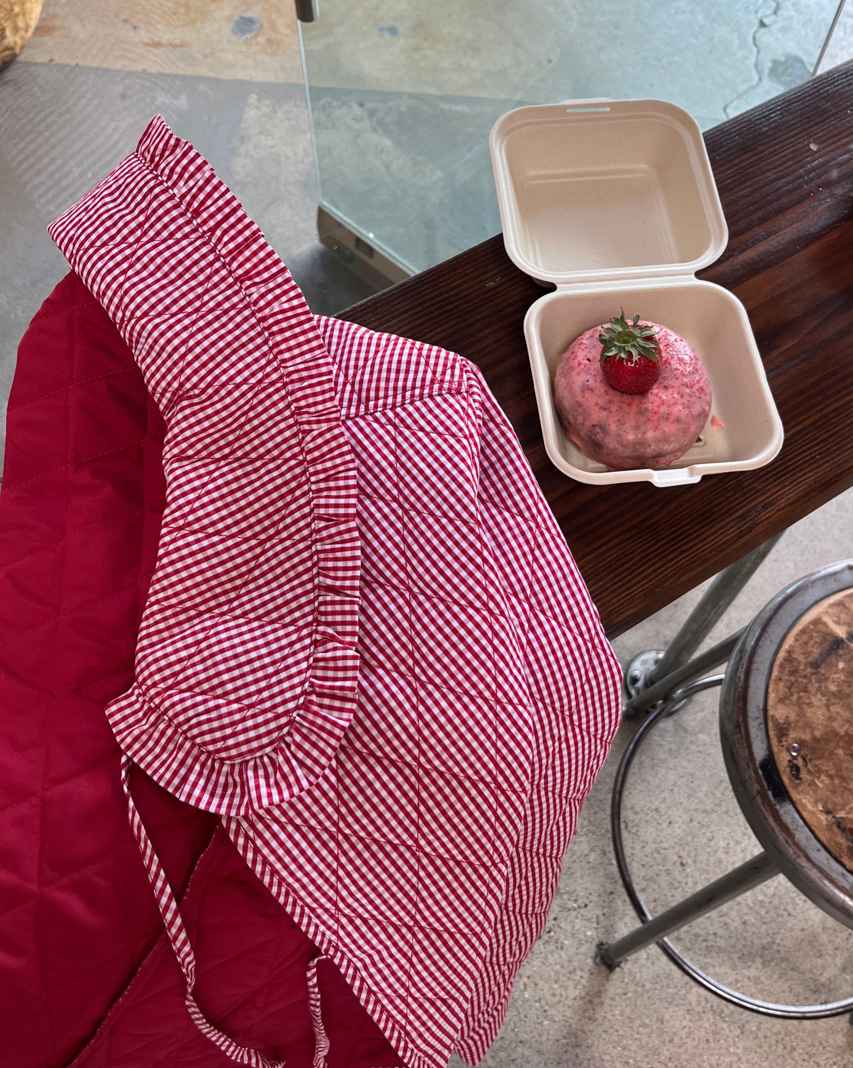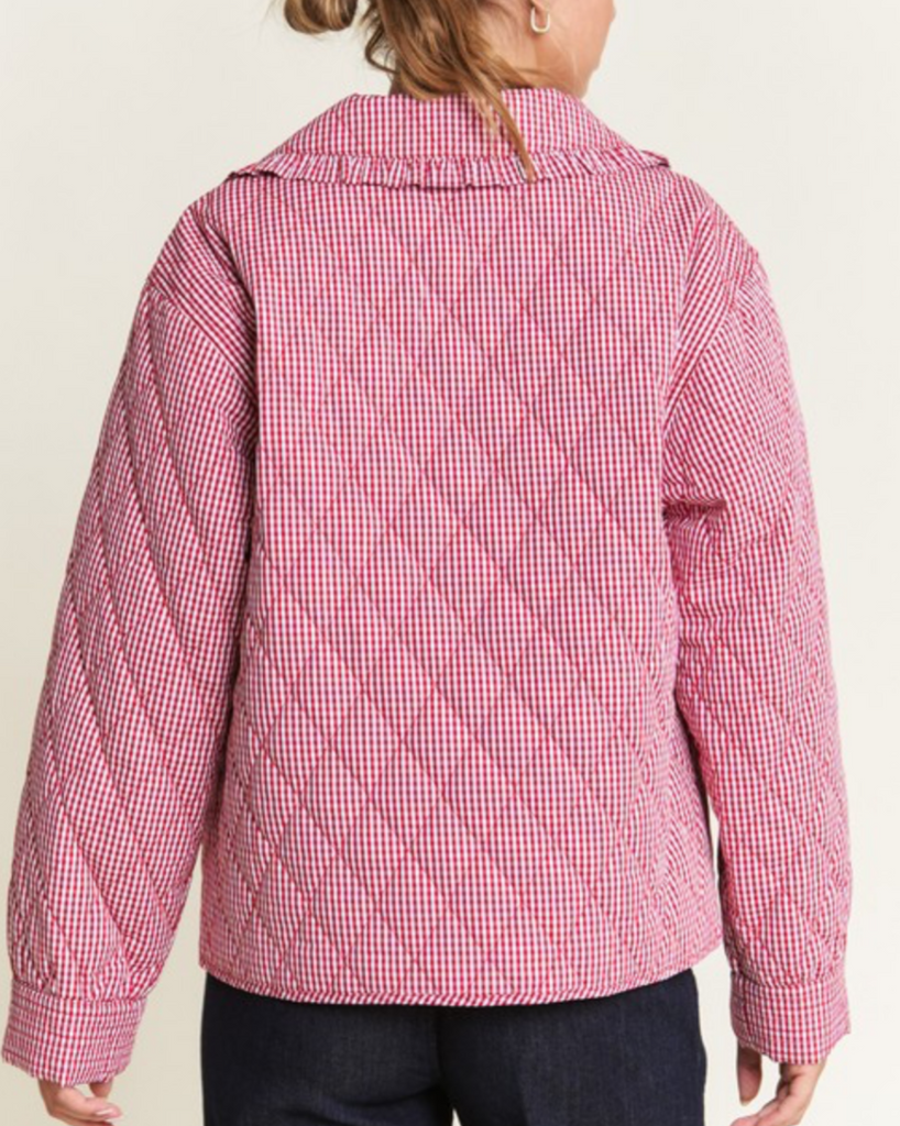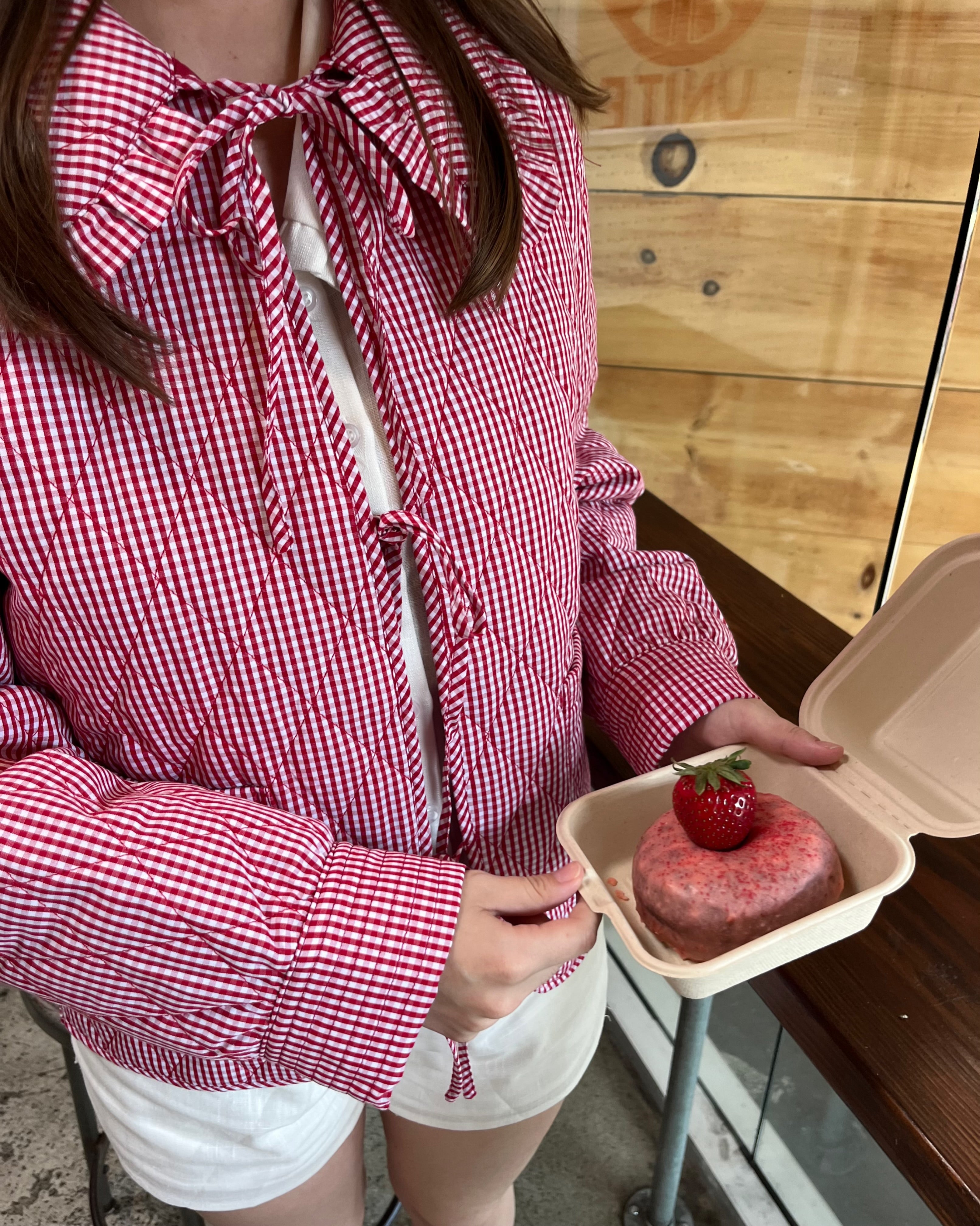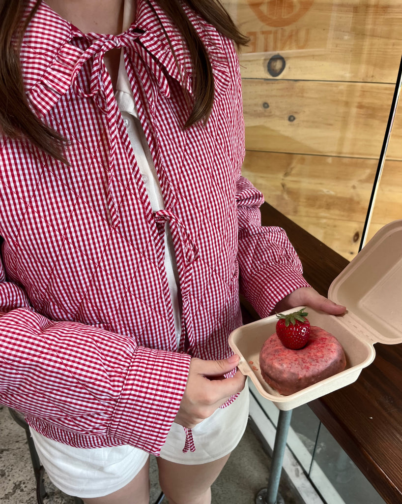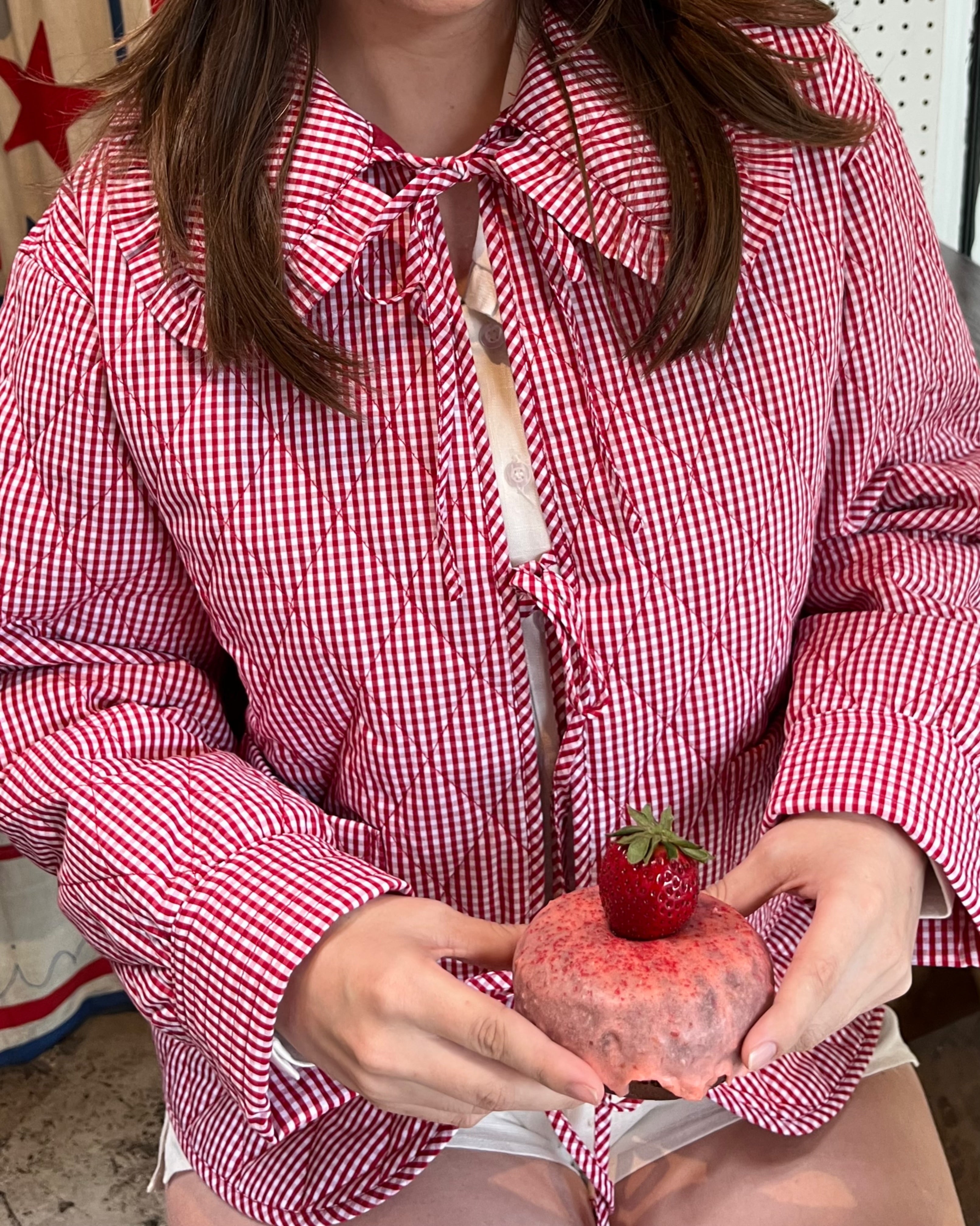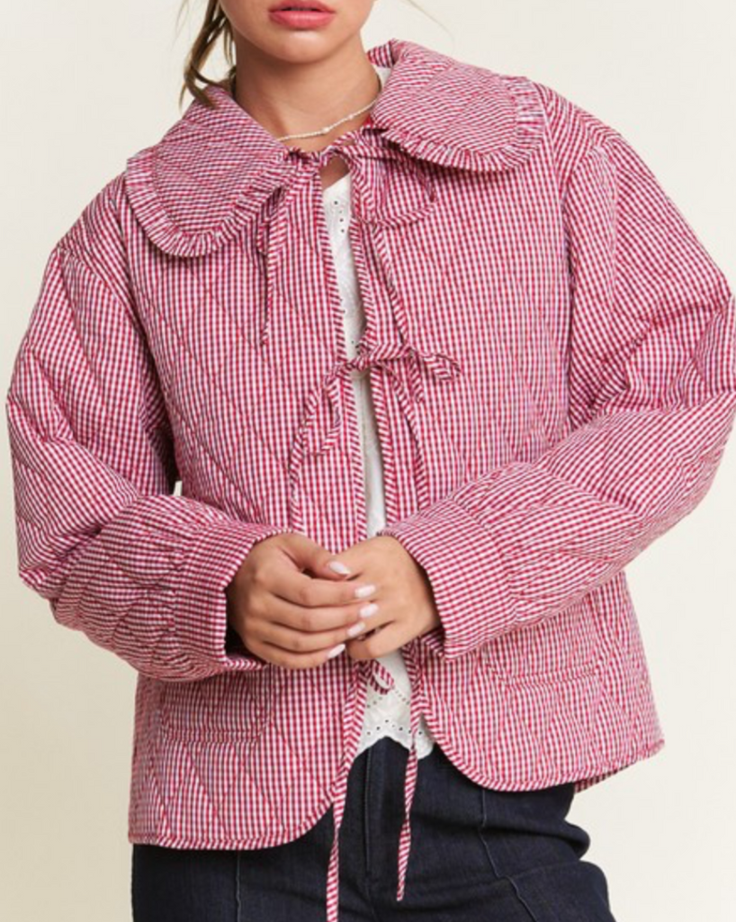Red quilted gingham jacket with front bow tie detail and peter pan collar.