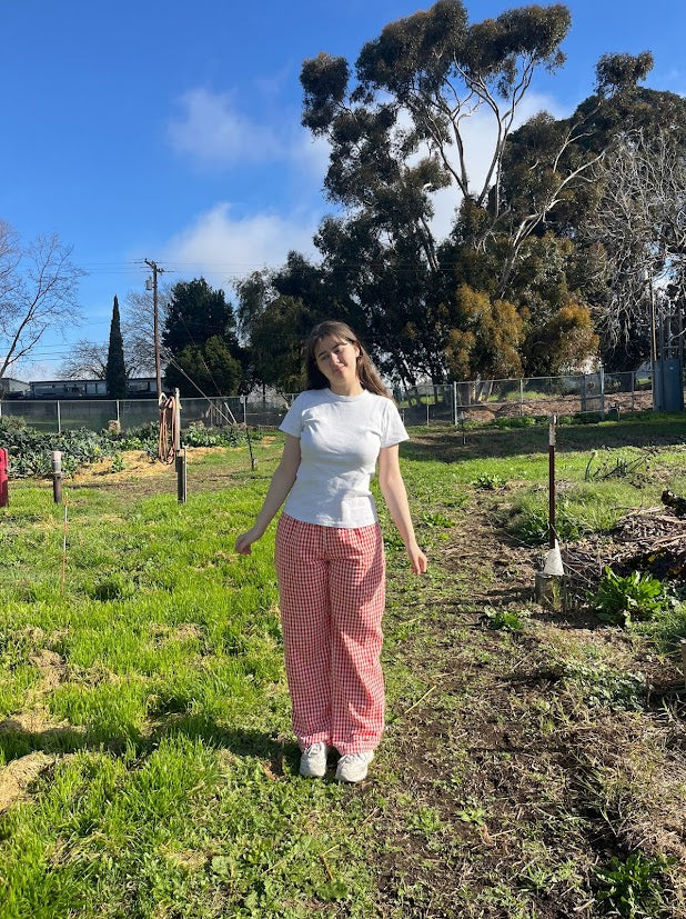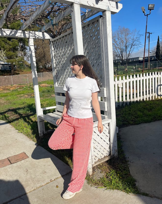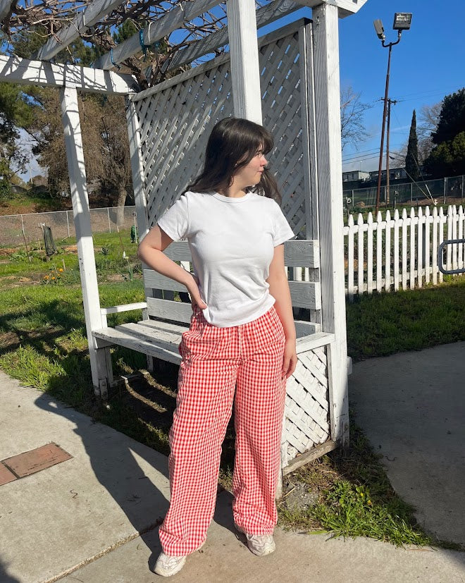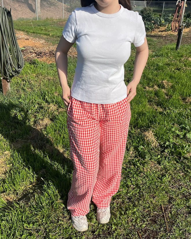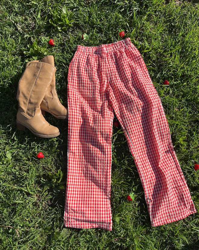 Red gingham pants with an elasticated waistband, two back pockets, and fully lined. An easy, everyday essential for effortless comfort and wear.