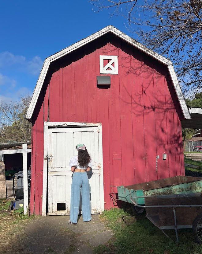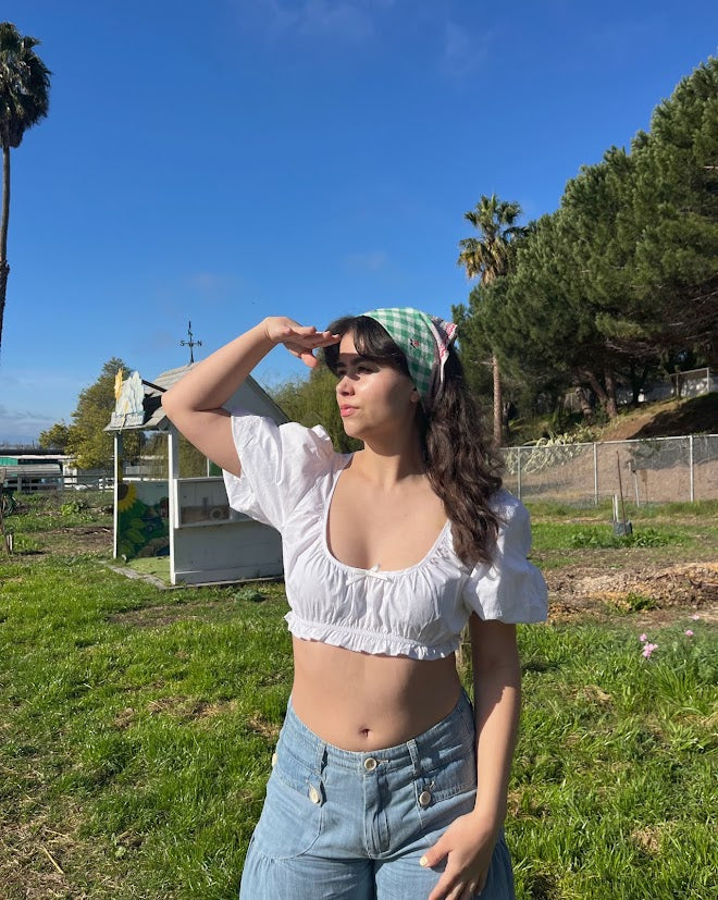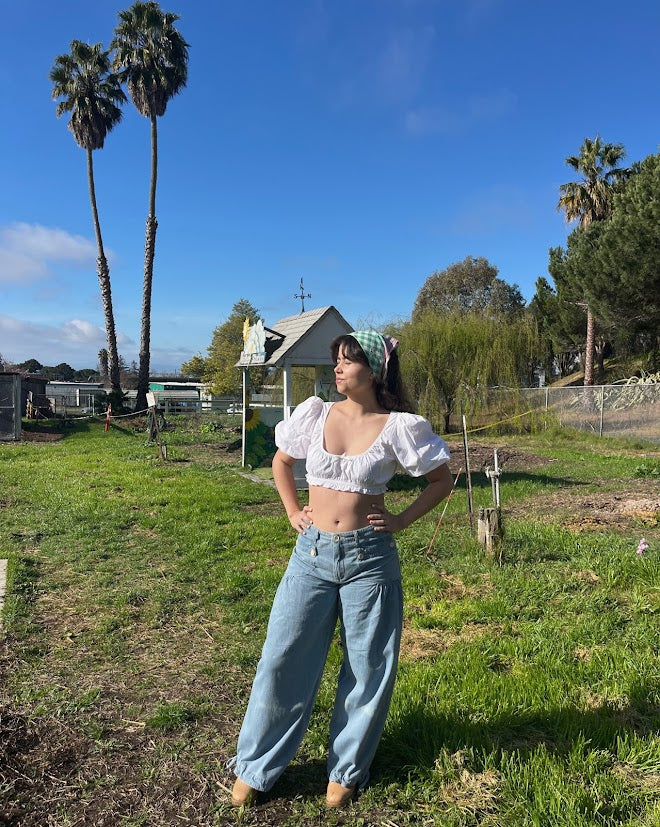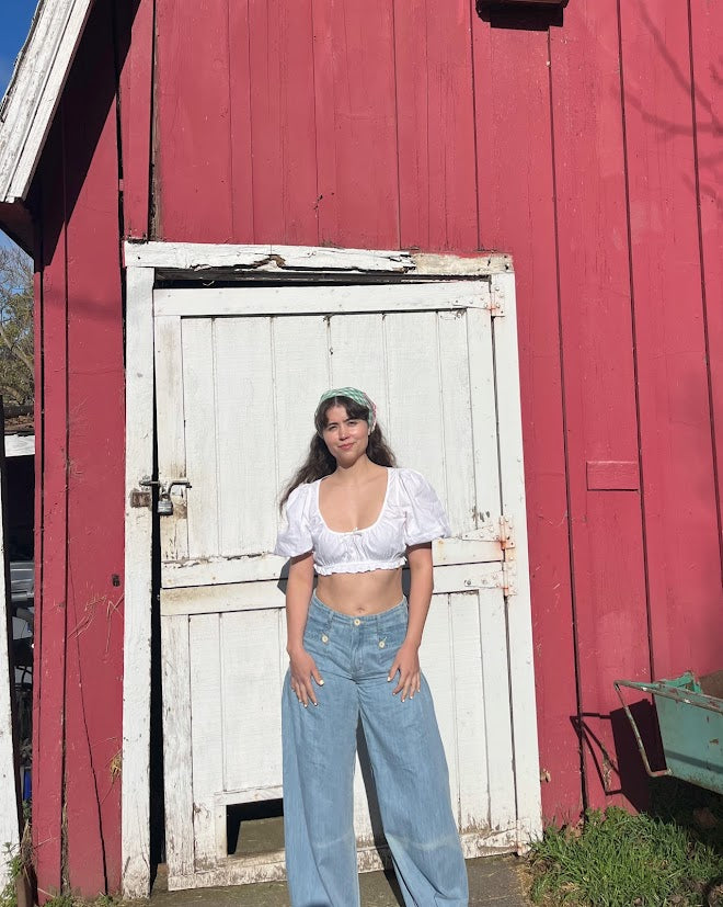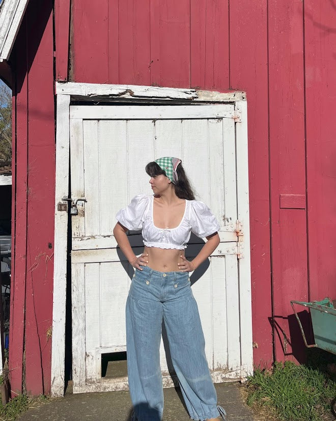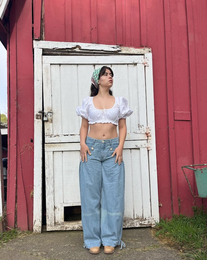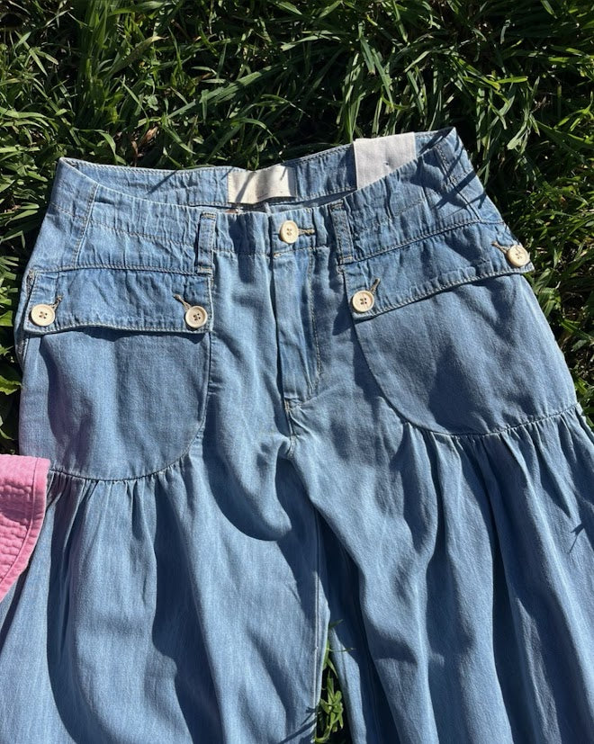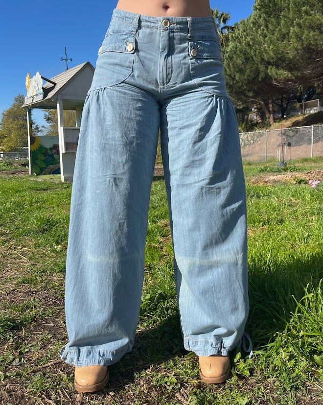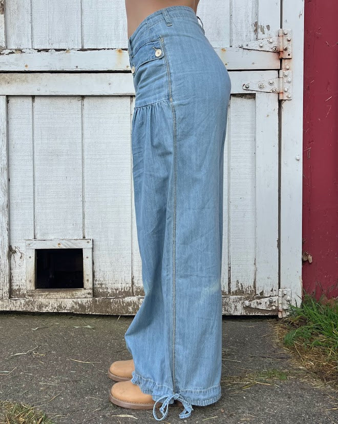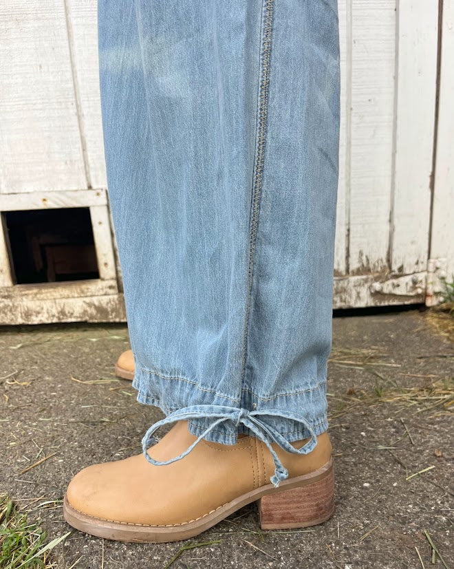 100% cotton denim pants with dropped front patch pockets, pleated detailing throughout, and cinch-tie banded ankles for adjustable comfort and shape.